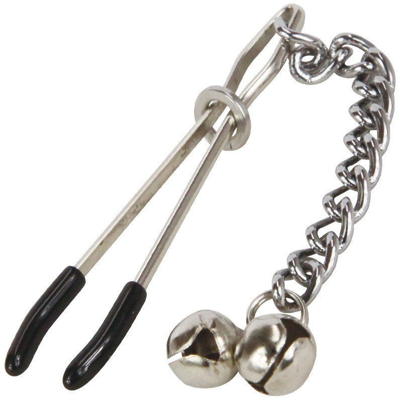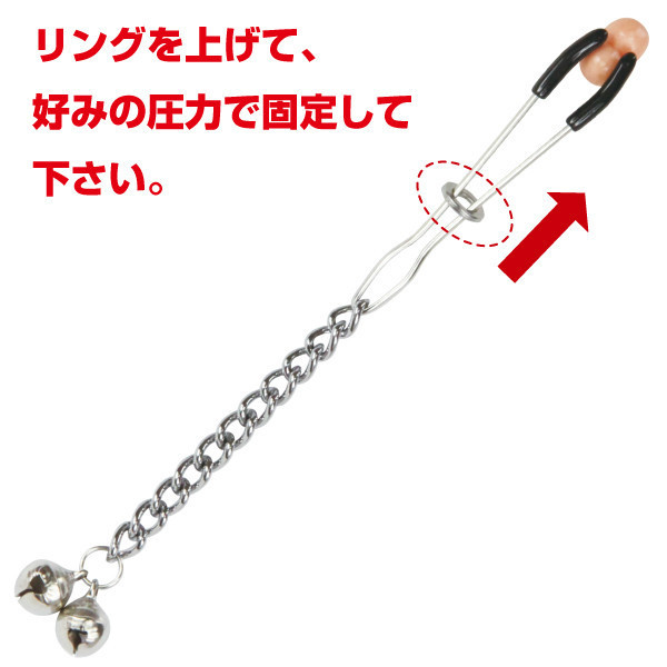 リングで圧加減を調節すれば装着完了!快感に身をよじらすたびに、チェーンで繋がれた鈴がチリンチリンと軽やかに音色を奏でるボディクリップです。