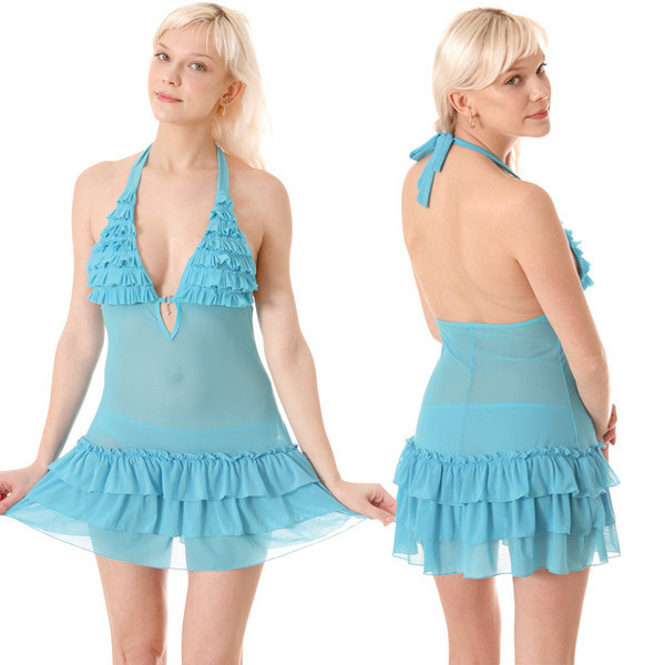 ●ホルターベビードール(調節可)&ハーフバックショーツ●爽やかなサックスブルーカラー●ボリューミーなフリルでメリハリづけ●フロントホック付き。
