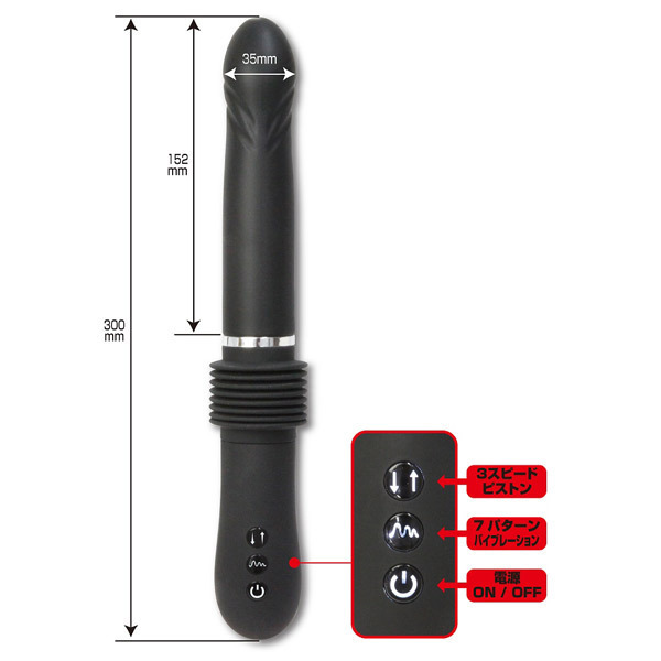 3段階のピストンスピードと7種類のバイブレーションを搭載!可動幅6cmの大迫力ピストンでポルチオに直撃しまくり、先端部分に搭載された強力モーターで快感振動が奥まで響き渡ります。