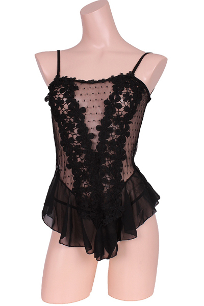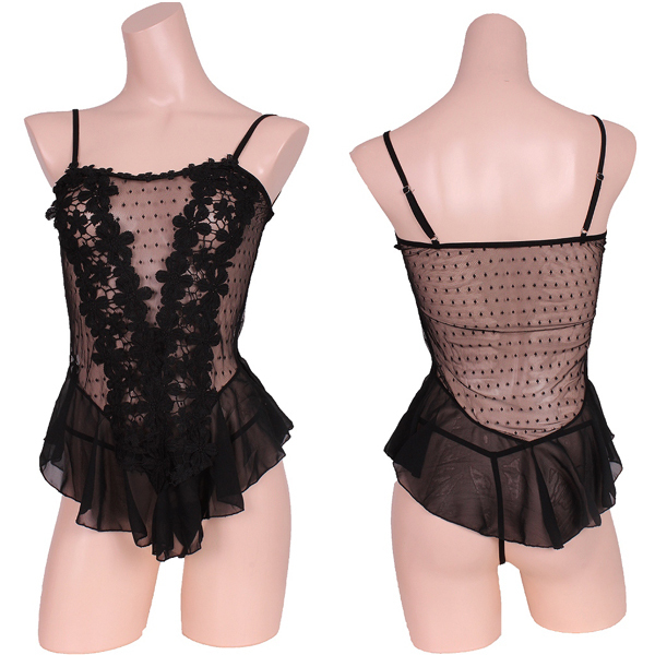 フロントに花柄モチーフをVラインにあしらい、裾のシフォンフリルでウエストのくびれを強調!ベースは模様入りストレッチネットだからフィット感抜群のベビードールとTバックの豪華セット。