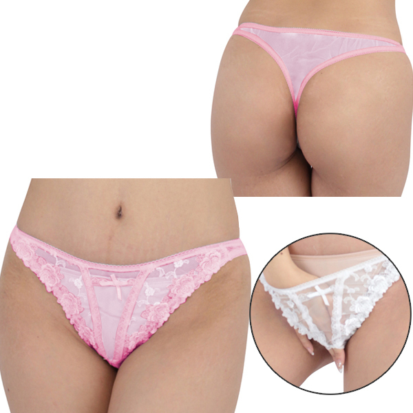 レースや花の刺繍をふんだんにあしらった可愛らしい日本製の極薄Tバック(ピンク)。