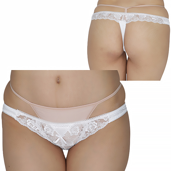 柔らかな光沢が美しい純白生地に、透け感のある花柄レースを組み合わせた日本製Tバック(白)。