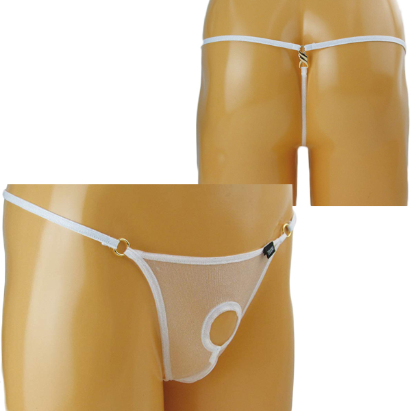 素肌が見えるシースルー生地でエロティックに見せつけるメンズ用Gストリング(白)。