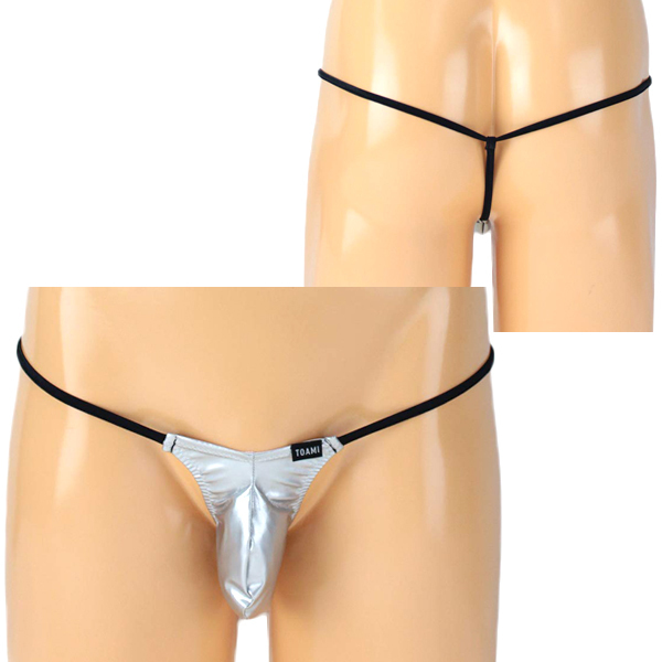 光沢感が美しいエナメル生地で男性のシンボルを魅力的にアピールするメンズ用Gストリング(シルバー)。