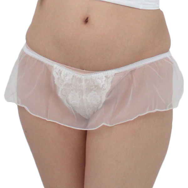 動くたびヒラリと揺れる♪可憐なレース刺繍のTバックとシースルースカートが一体型になった日本製セクシーショーツ(白)。