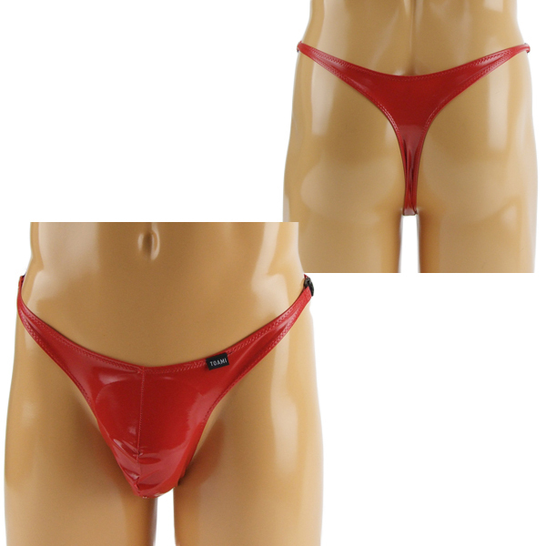 メンズ エナメル両サイドワンタッチバックル付きTバック レッド