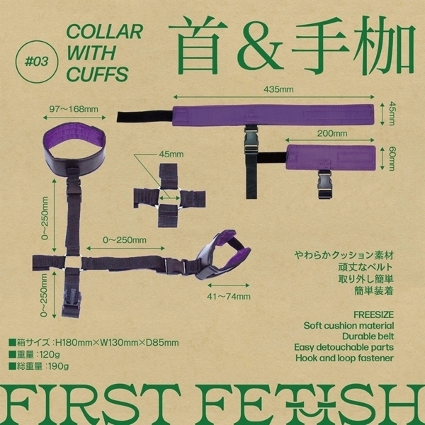 パッケージ:18.0×13.0×8.5cm 本体:首枷(4.5×43.5cm・内径9.7〜16.8cm)・手枷(6.0×20.0cm・内径4.1〜7.4cm)