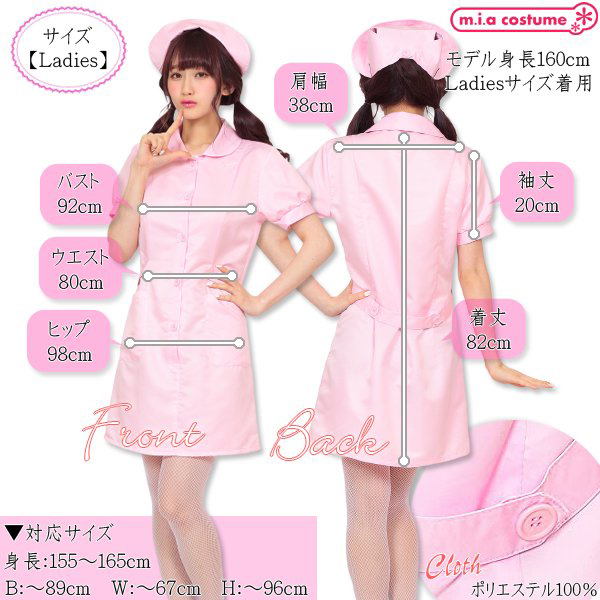 対応サイズ:身長155〜165cm・B〜89cm・W〜67cm・H〜96cm 実寸:B92cm・W80cm・H98cm・肩幅38cm・袖丈20cm・着丈82cm セット内容:ナースキャップ、ワンピース(前ボタン) 素材:ポリエステル100% モデル身長160cm