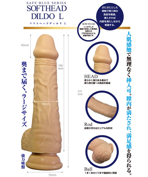 安心・安全で気持ちよくをコンセプトに、青山夏樹がグッズをプロデュース!『セーフブルー シリーズ』リアル形状の本格ディルド!本体はしっかりした硬度で本格的な満足感を得られつつ、先端はぷにぷにと柔らかいため挿入時の膣への負担を軽減しています。