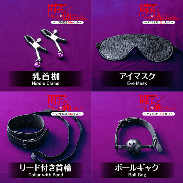 手にしてすぐに使える人気SMプレイの10点セット「悶子のいやぁーん感じちゃう」!このセットさえあれば、目隠しから拘束プレイにスパンキング、緊縛プレイにクリップ責めなどソフトなSMプレイが存分に楽しめます♪初心者でも手軽にSMが楽しめる!口の動きを遮るボールギャグやペット気分で楽しむリード付き首輪、バラムチにリード付き首輪、焦らしプレイが楽しめるフェザーにロープなど多彩なプレイができるアイテムを同梱!初めてSMプレイを楽しみたいカップルの方には特におすすめです。